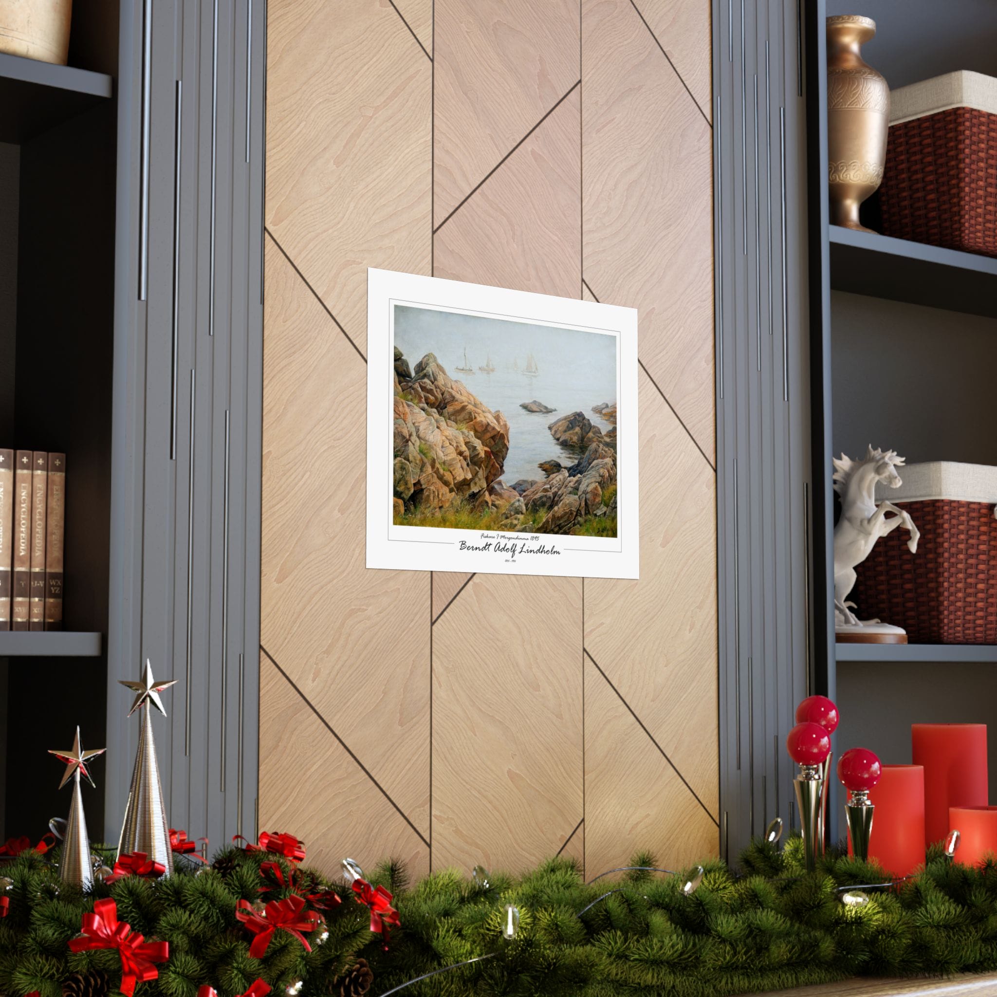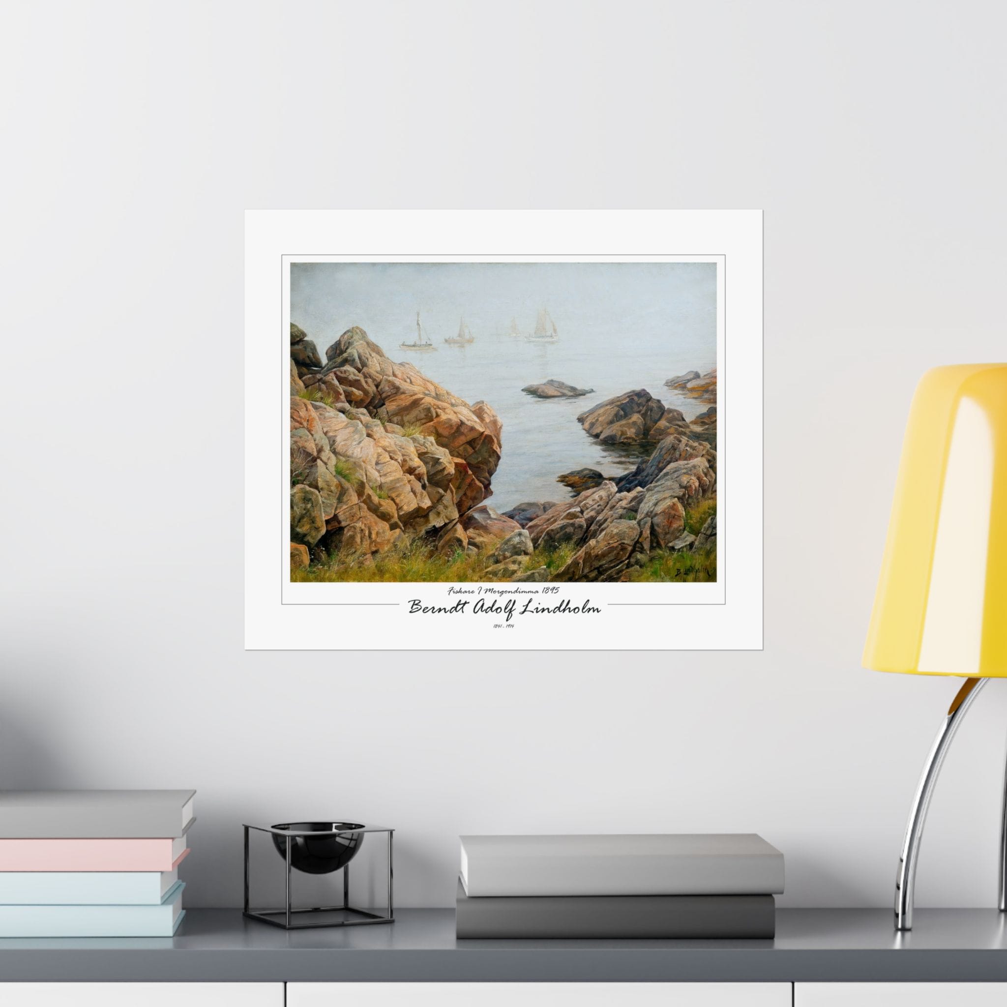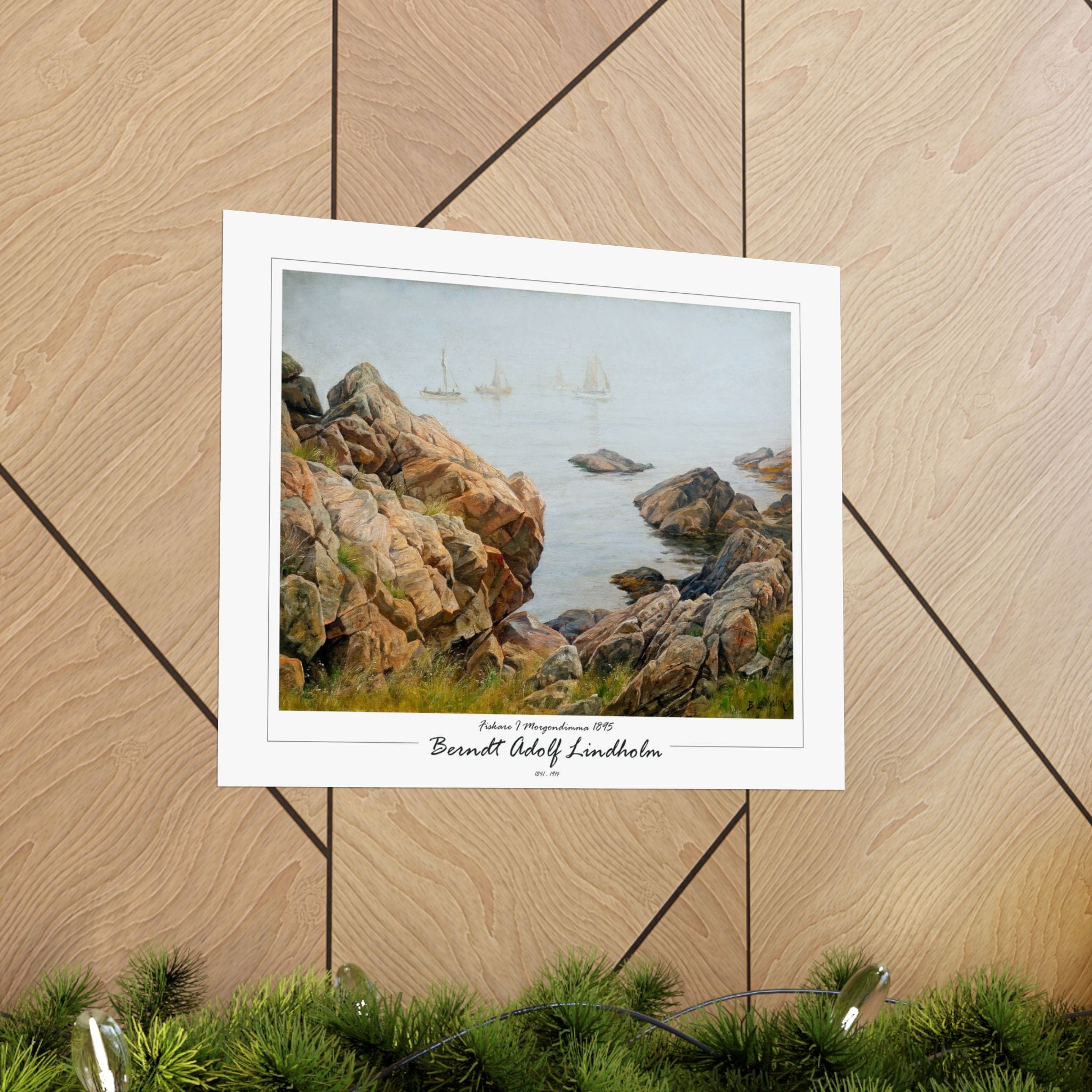Immerse yourself in the serene beauty of Berndt Lindholm’s “Fiskare i Morgondimma” (Fisherman in Morning Mist). This captivating painting depicts a fisherman enveloped in the soft, ethereal light of the morning mist. Lindholm, a celebrated Finnish landscape painter, masterfully captures the unique light and atmosphere of the Nordic landscape, showcasing his early Impressionist influences and association with the Düsseldorf School.