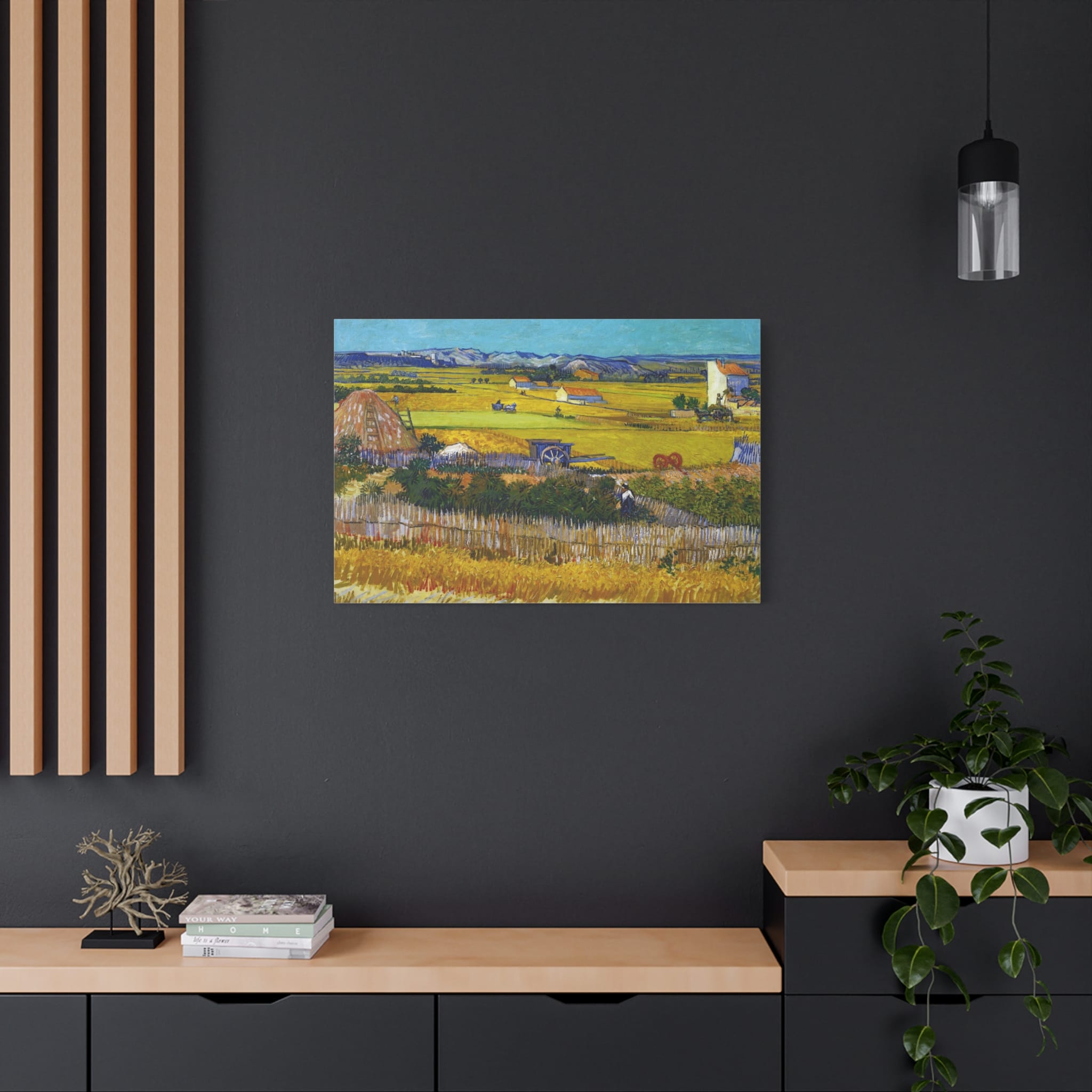 “De Oogst” (The Harvest), painted in 1888, is a vibrant depiction of the harvest season in the south of France. This masterpiece showcases van Gogh’s fascination with rural life and the natural landscape. The painting features golden wheat fields under a bright, expansive sky, with farmers diligently working in the background. Van Gogh’s dynamic brushstrokes and rich color palette bring the scene to life, capturing the warmth and energy of the harvest. This canvas print is perfect for adding a touch of pastoral beauty and timeless artistry to any space.