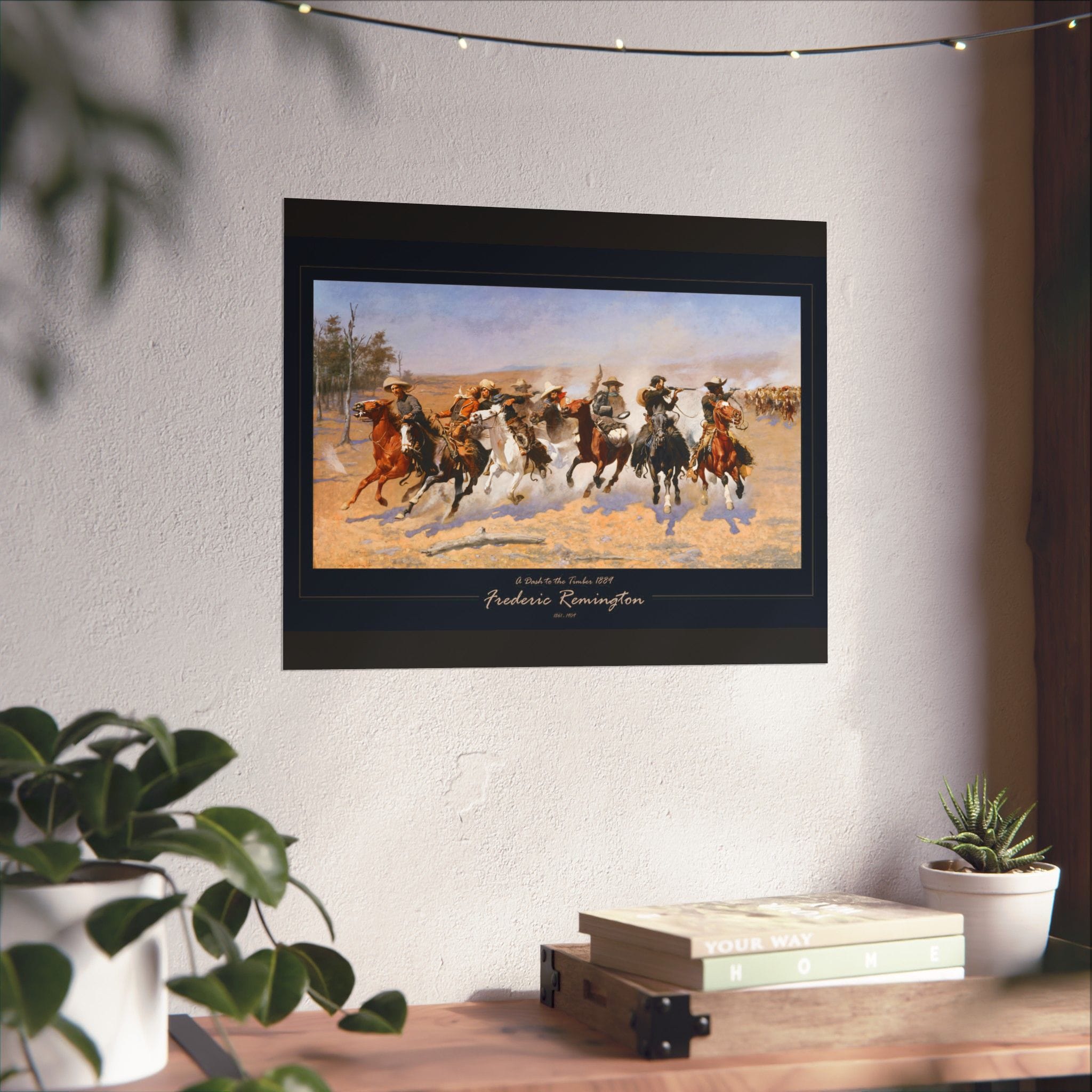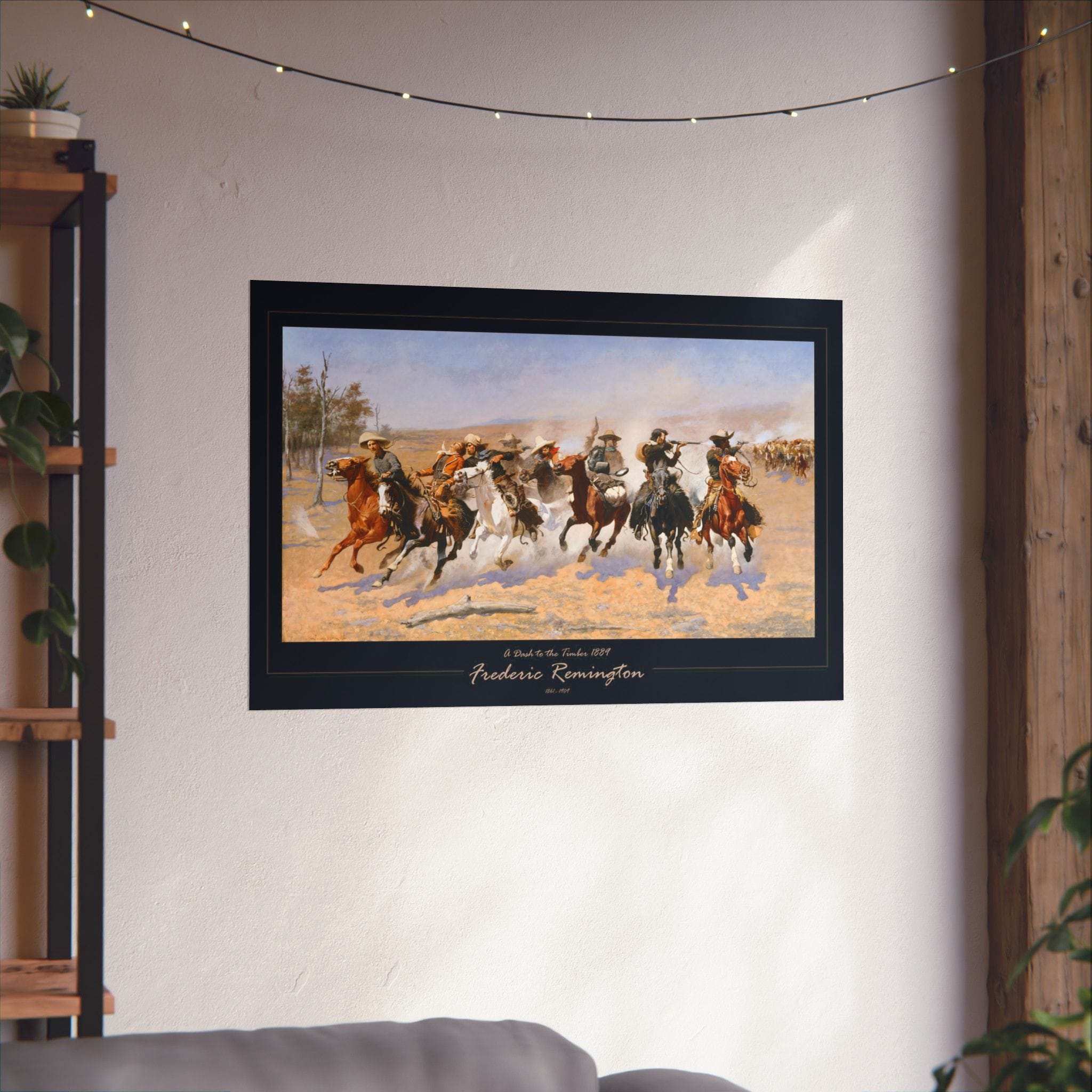 Capture the raw energy of the American frontier with this high-quality Western art poster featuring “A Dash for the Timber” by legendary artist Frederic Remington. Originally painted in 1889, this iconic scene showcases a group of cowboys in a dramatic horseback escape, galloping toward the treeline with dust flying and danger close behind.