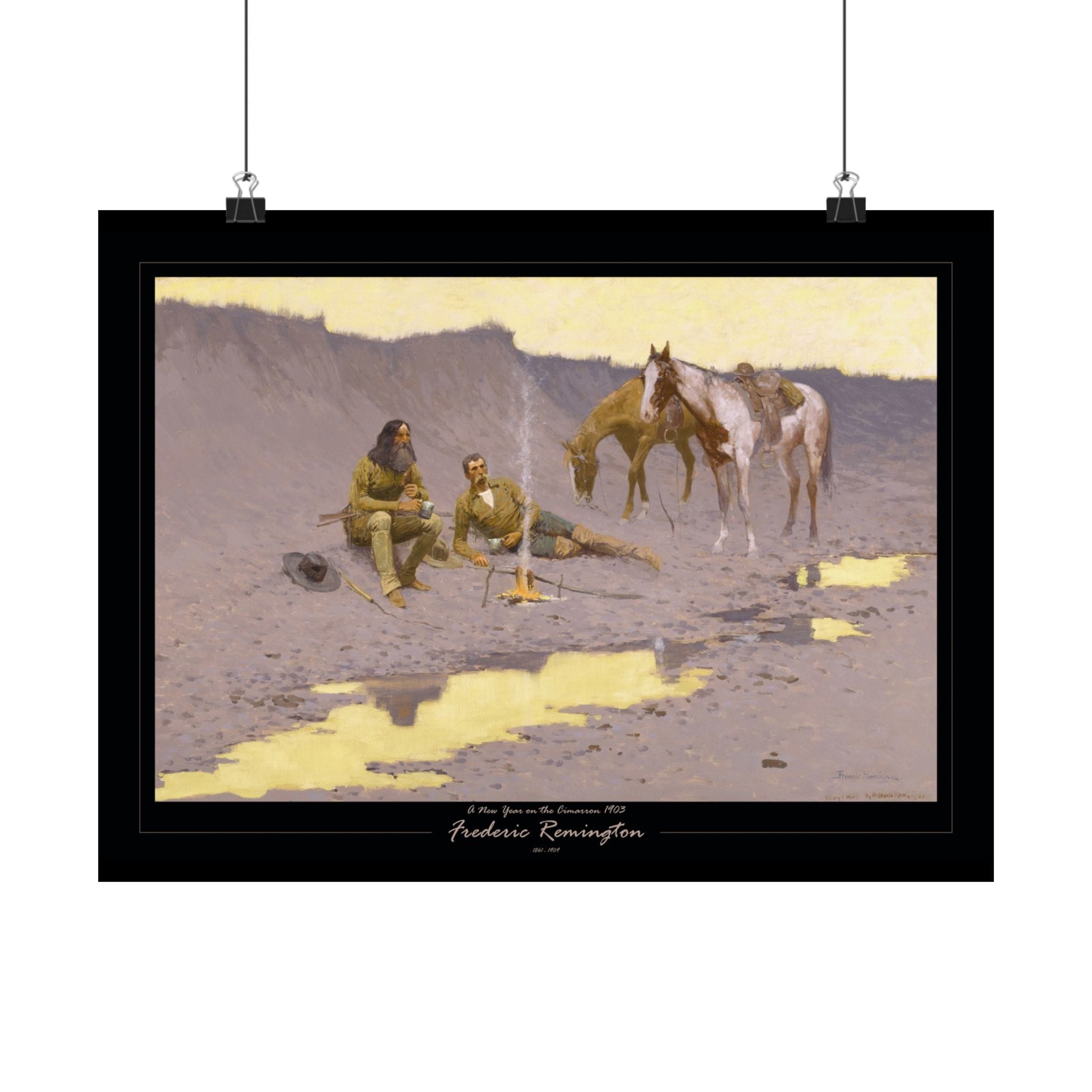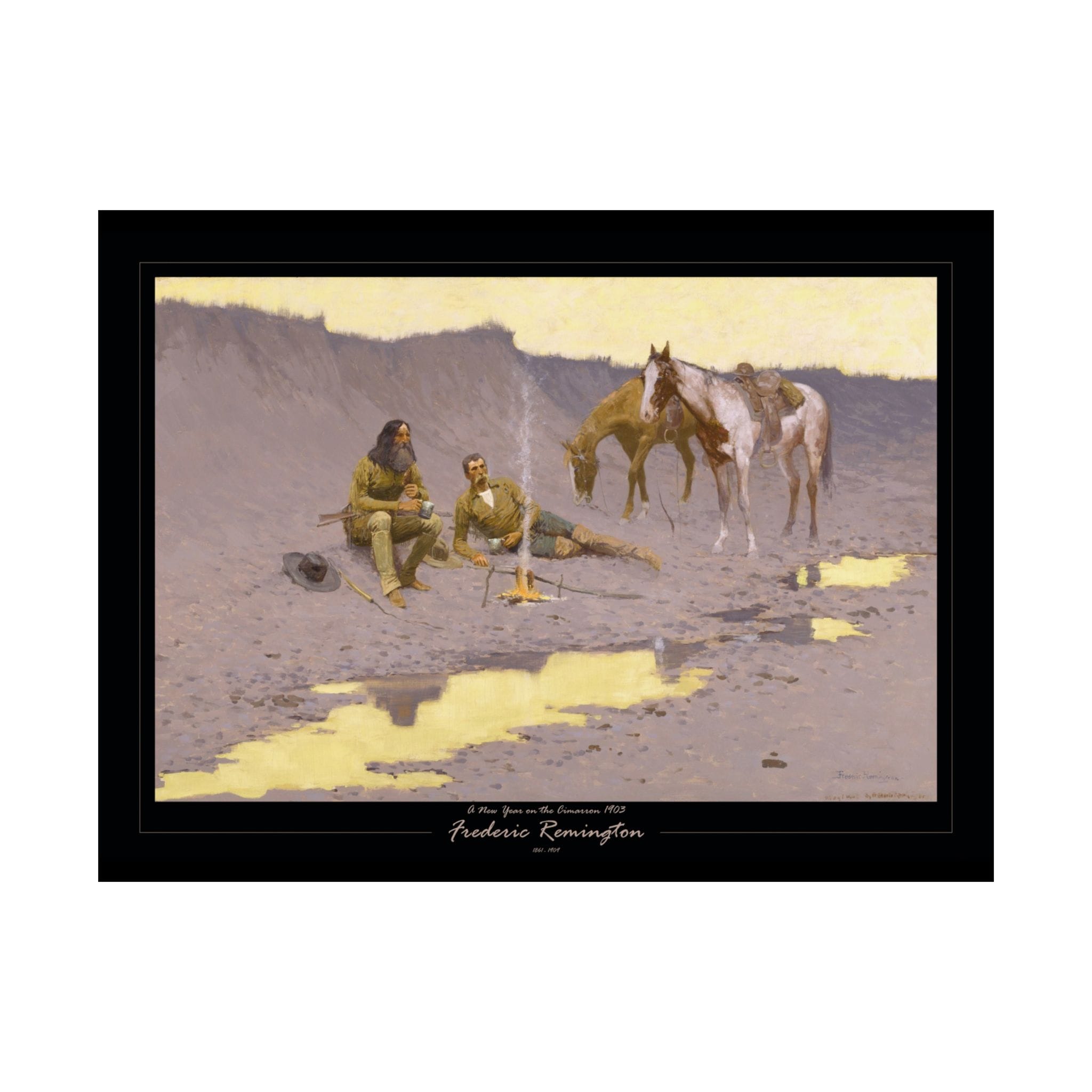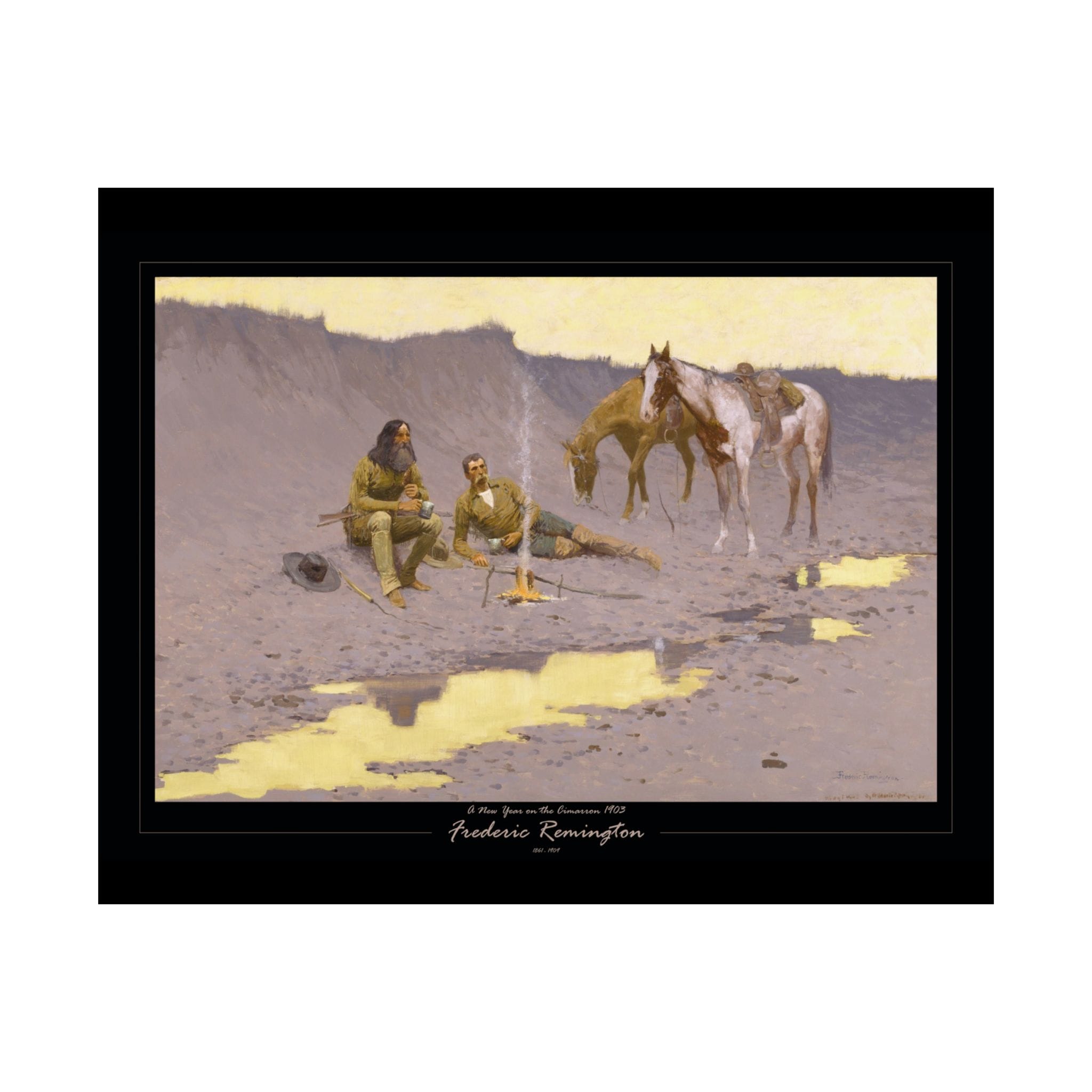 Bring the spirit of the American frontier into your home with this stunning Western art print of “A New Year on the Cimarron” by legendary artist Frederic Remington. Originally painted in 1903, this timeless scene features a group of cowboys gathered around a glowing campfire along the Cimarron River, welcoming the new year beneath a vast, wintry sky.