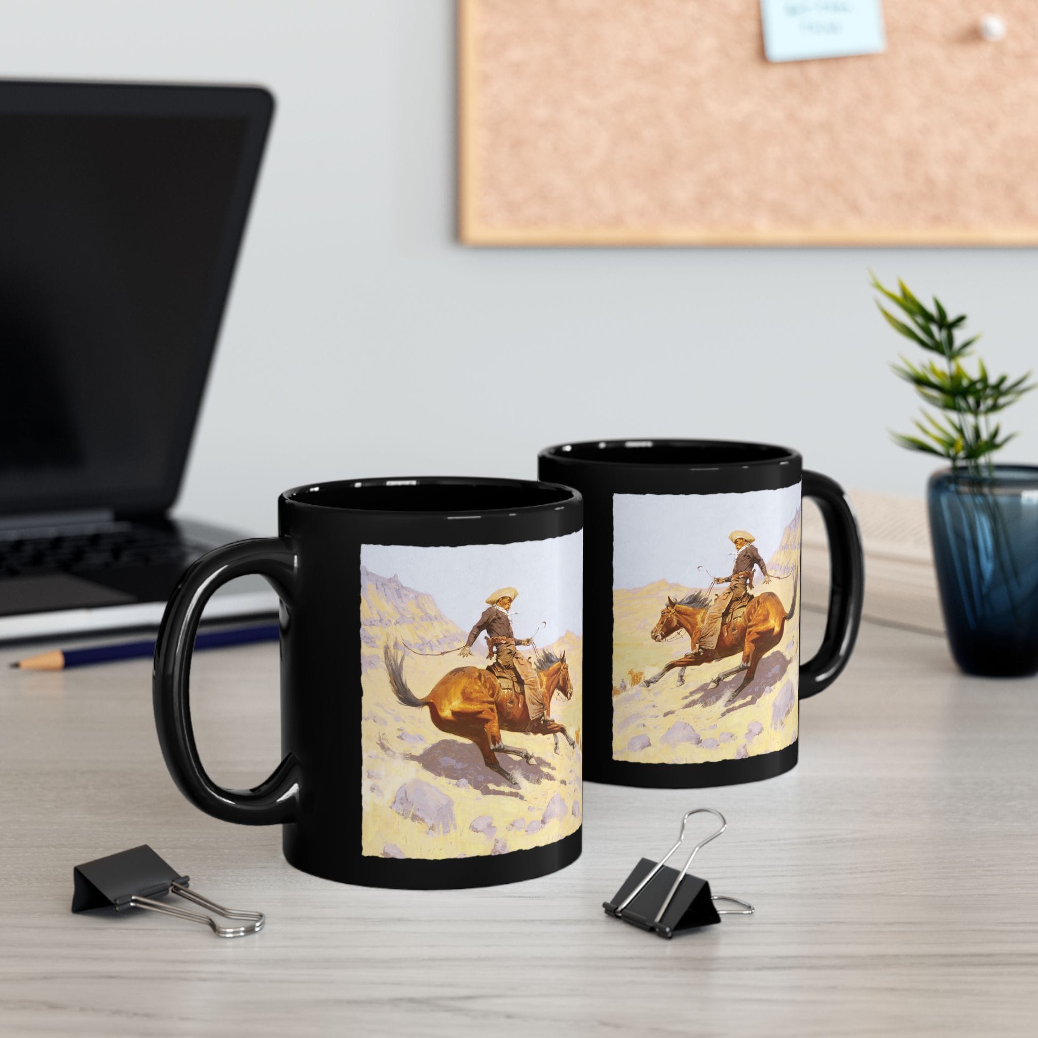 Whether you’re sipping morning coffee or evening tea, this mug brings a touch of Western heritage to your daily routine. The rich black finish provides a dramatic backdrop for the detailed image, making it a standout piece in any kitchen or office.