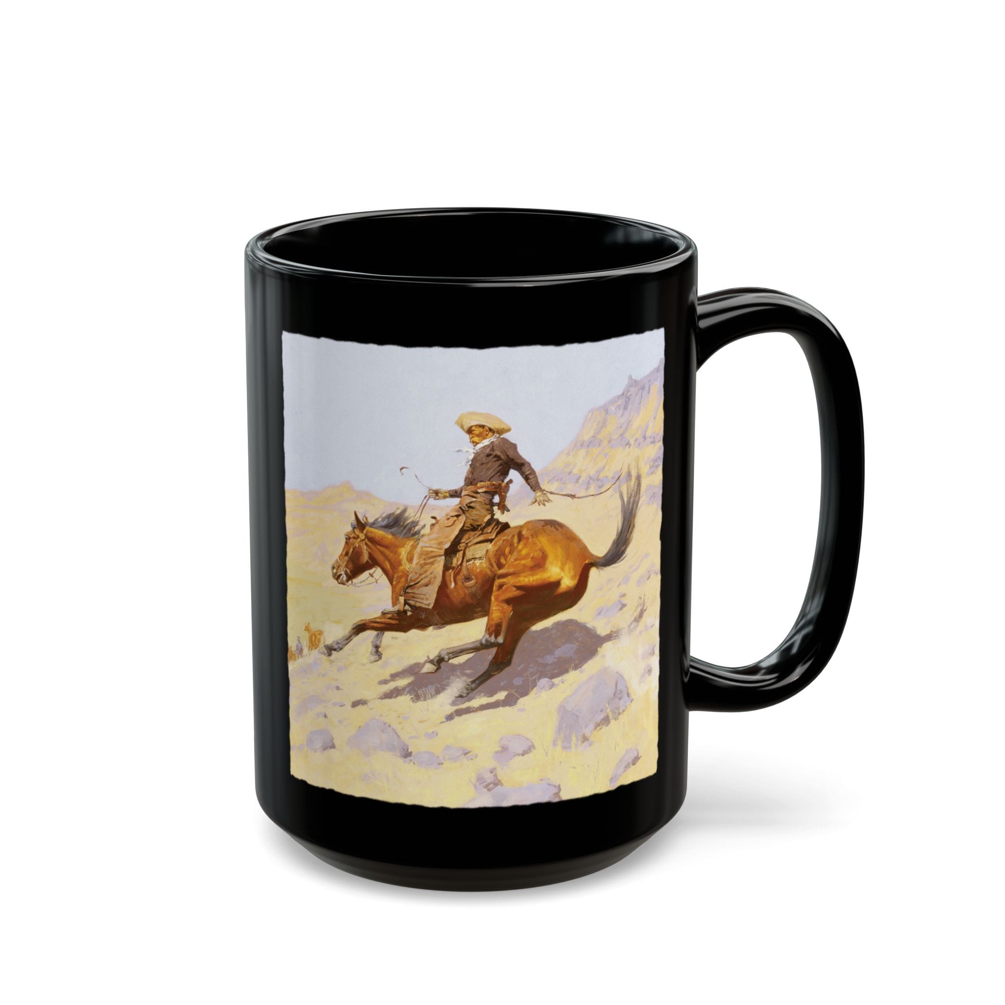 Whether you’re sipping morning coffee or evening tea, this mug brings a touch of Western heritage to your daily routine. The rich black finish provides a dramatic backdrop for the detailed image, making it a standout piece in any kitchen or office.