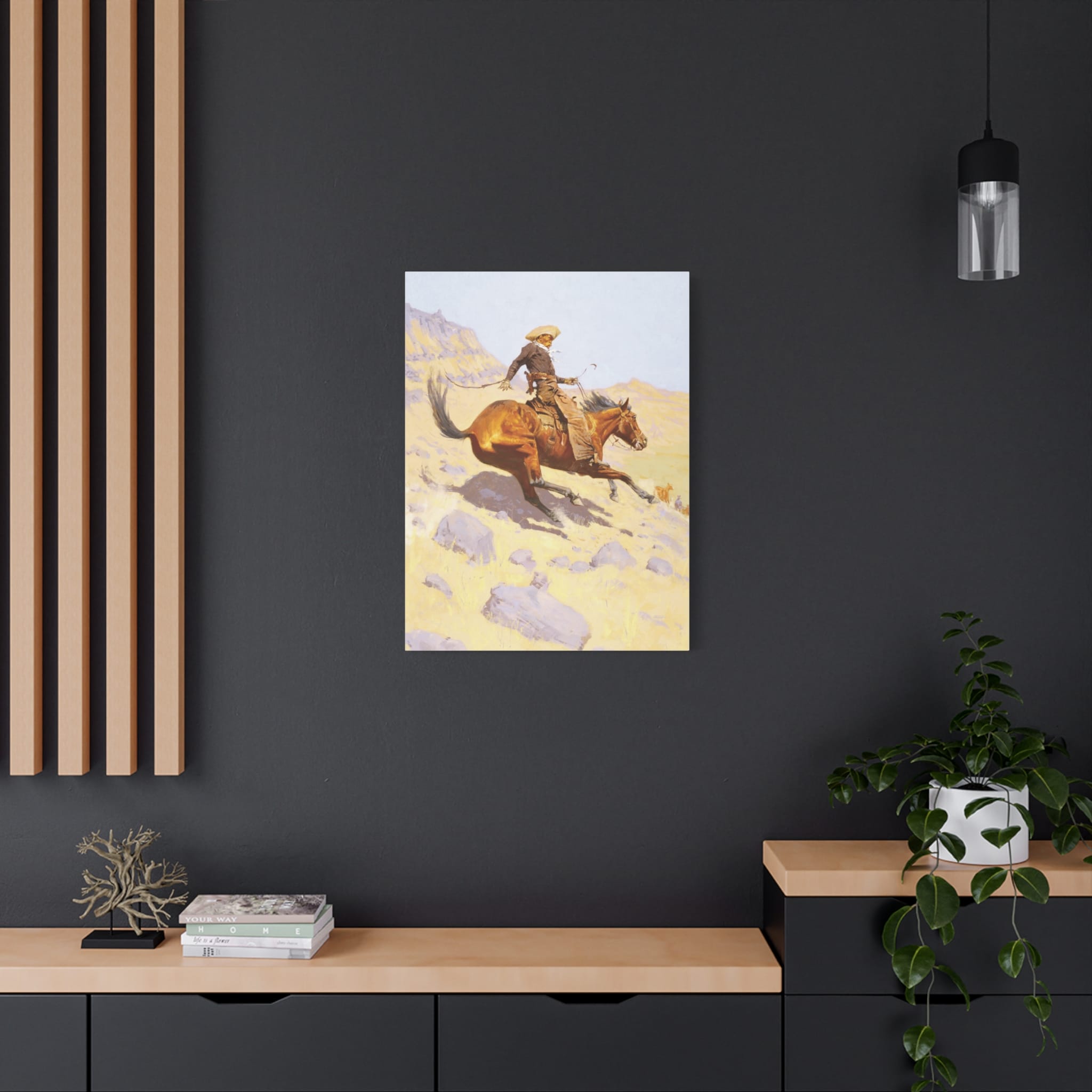 This canvas print is of a timeless tribute to the rugged spirit of the American West. Remington’s “The Cowboy” 1902 captures the raw energy and independence of frontier life. With bold brushwork and dynamic composition, the painting immortalizes the lone rider—hat tipped, reins taut—charging across the open plains.
