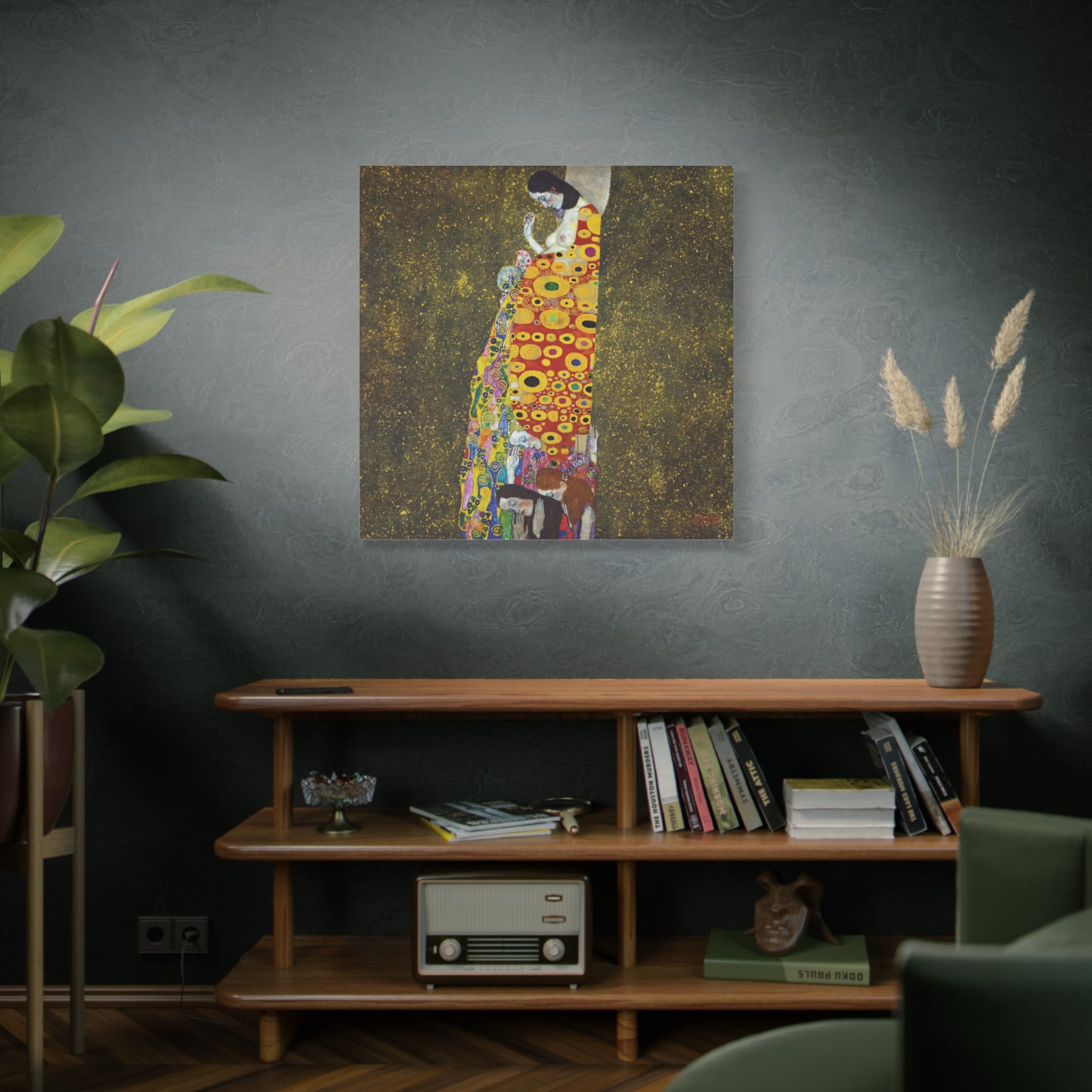 A pregnant woman bows her head in prayer, with a death’s head peeking from behind her stomach, symbolizing danger. At her feet, three women also bow their heads, possibly in prayer or mourning. Despite the gravity, the painting, titled “Hope, II,” is rich in decorative beauty. Klimt, inspired by diverse sources like Byzantine art and Persian rugs, combines archaic traditions with modern psychological themes. His work reflects the coexistence of birth, death, and sensuality, influenced by the cultural crossroads of Vienna and the era of Freud.