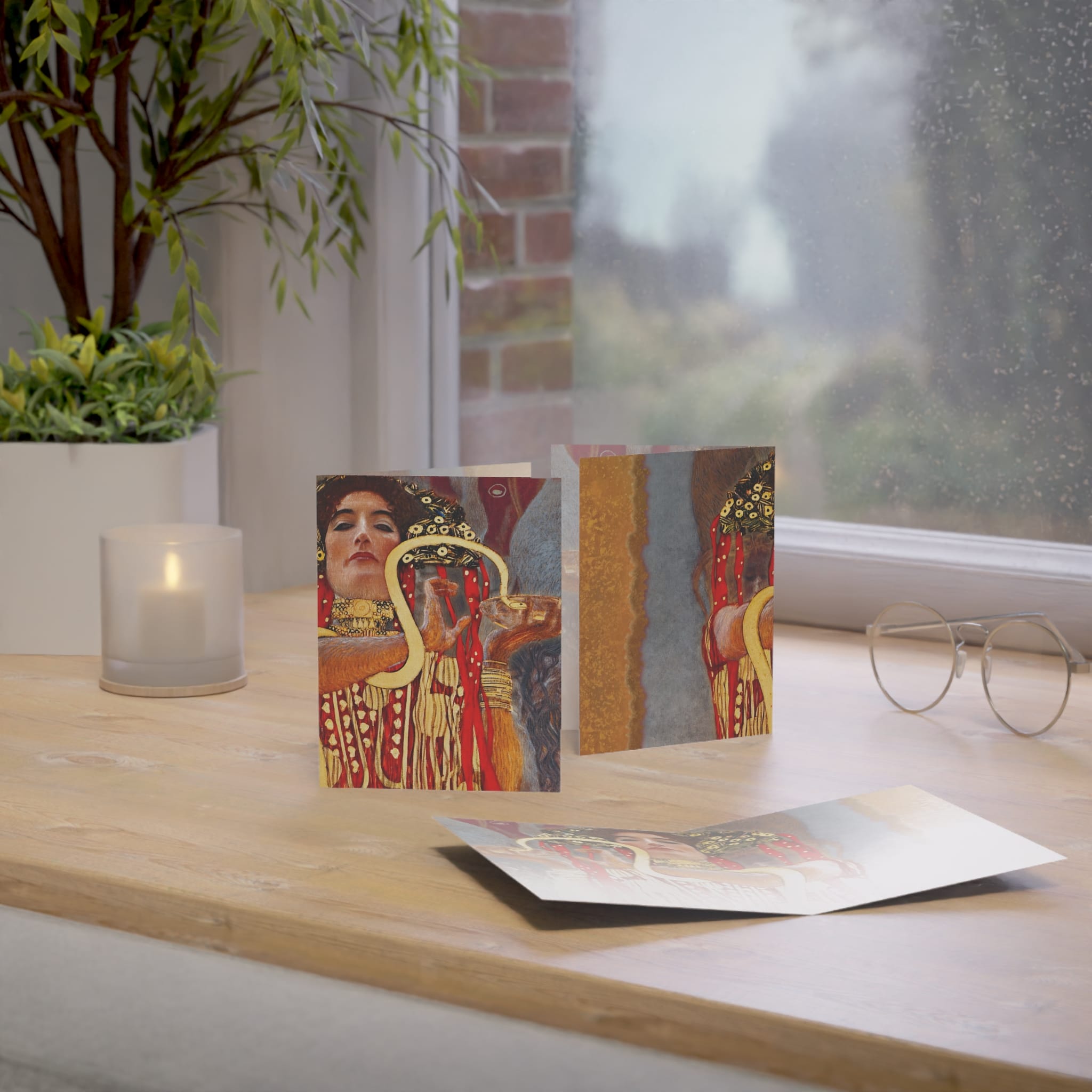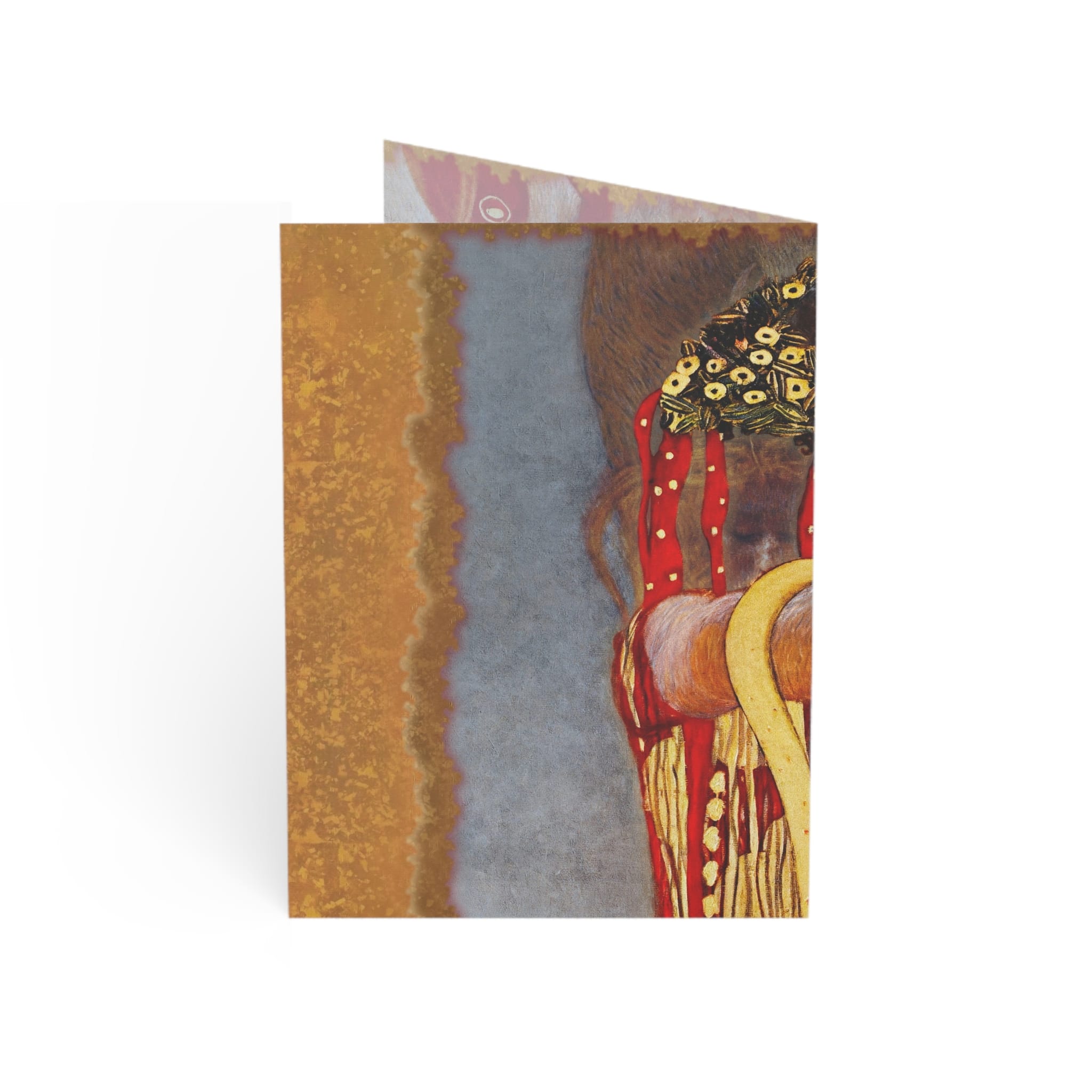 Klimt adhered to traditional depictions of Hygeia but added a column of light, nude figures, and a skeleton to symbolize Death. This portrayal received criticism for its lurid depiction of the human form and the suggestion that medicine couldn’t prevent death. Medicine was one of Klimt’s early works exploring the female form in detail. This image is a 1/6th representation of the original featuring Hygeia in a new light. This image represents a detail from that painting.