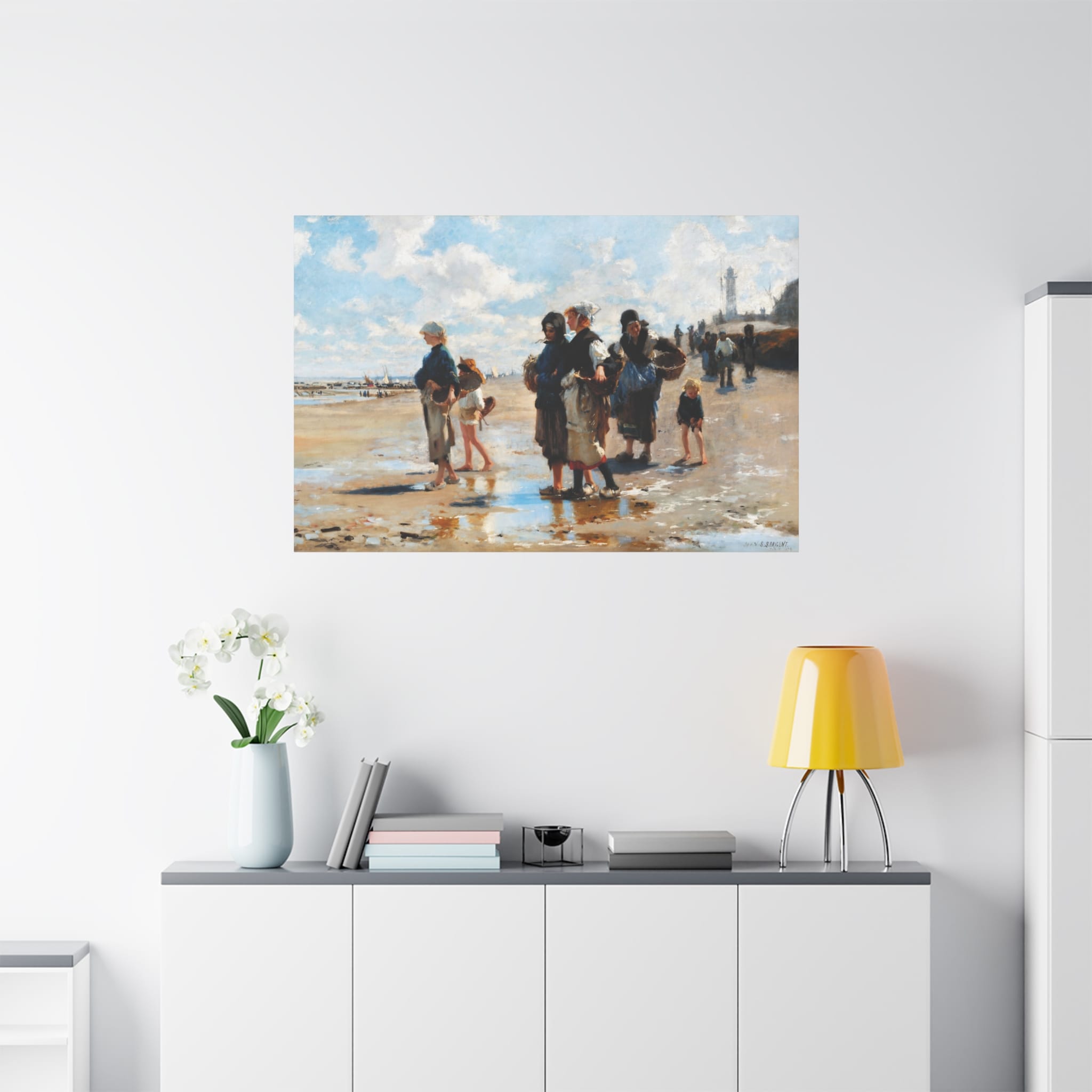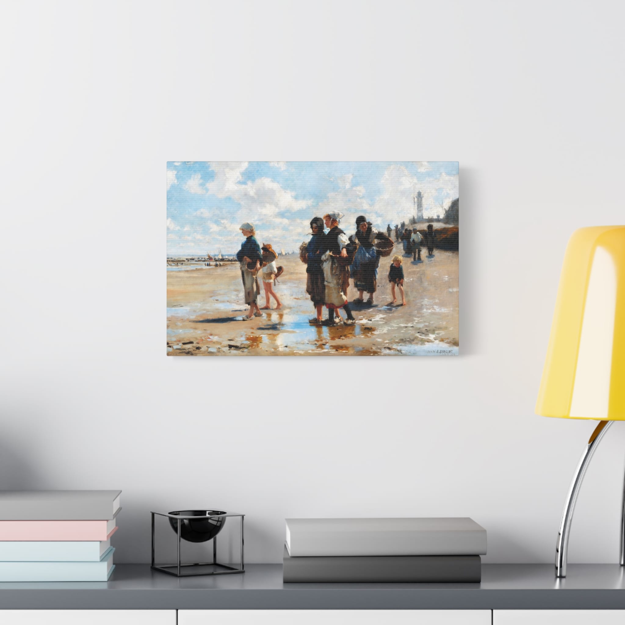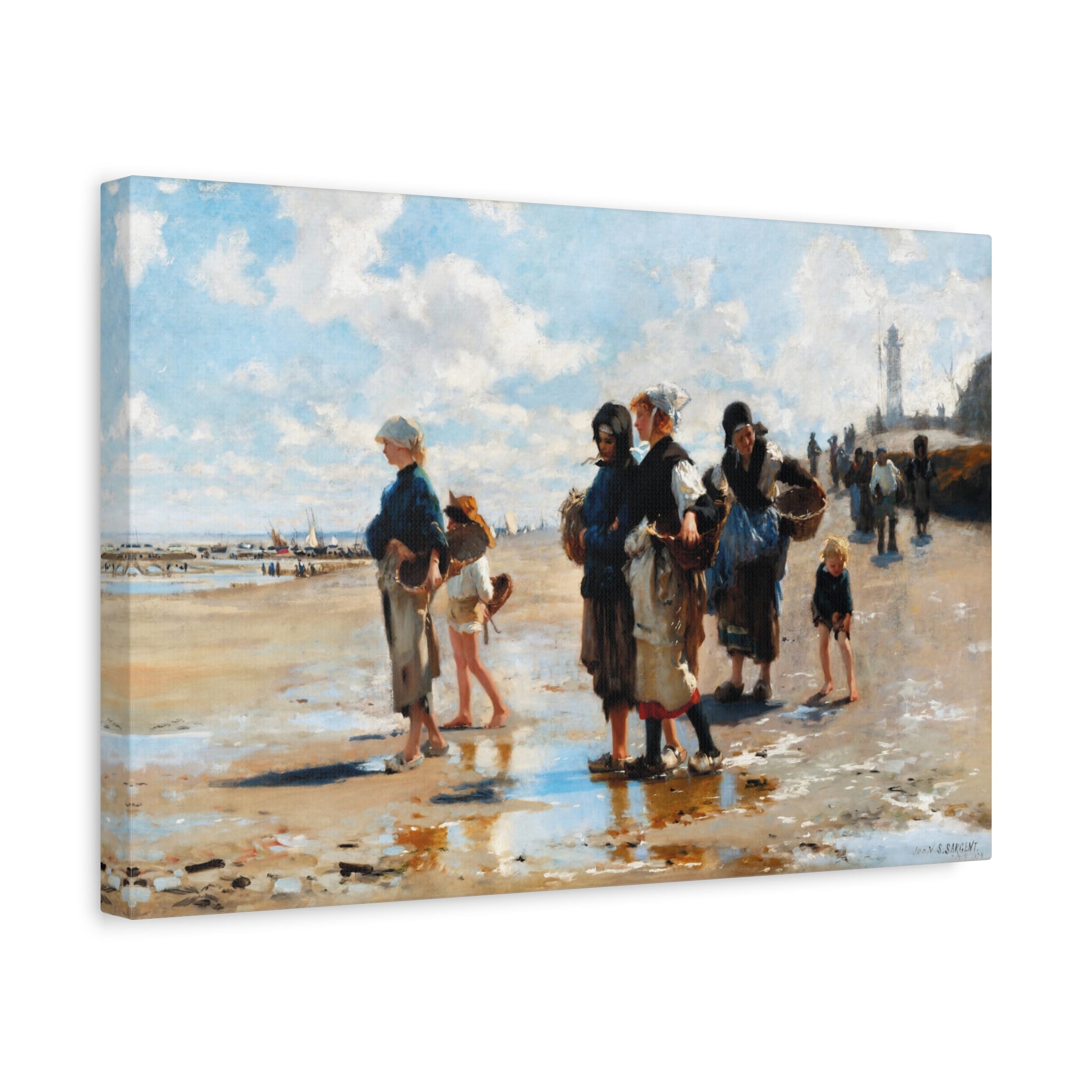 “En route pour la pêche” depicts a scene in the fishing village of Cancale, Brittany. Women and children gather fish and shellfish from shallow pools against a backdrop of the town’s quay, lighthouse, and cloud-filled skies. John Singer Sargent’s composition and brushwork bring freshness to the 19th-century subject of peasant life.