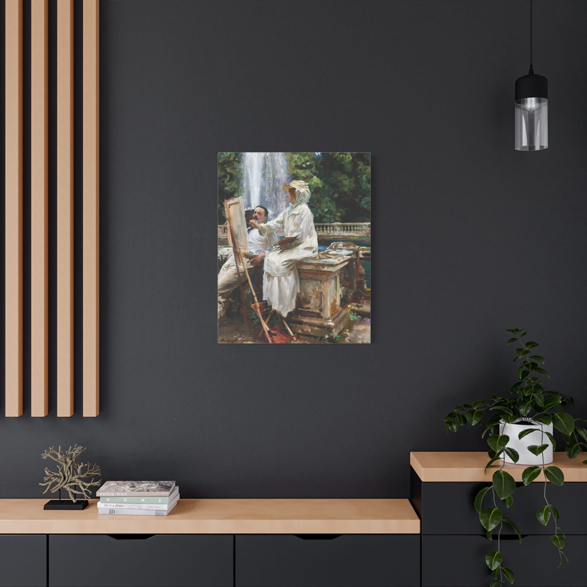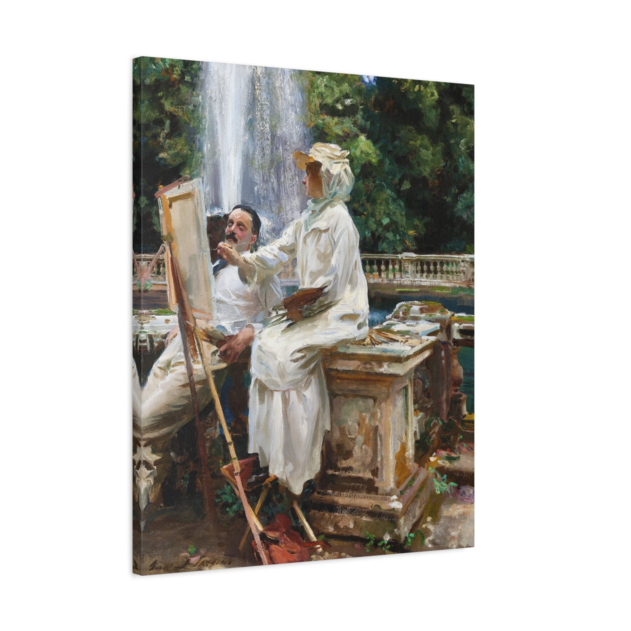 Add a touch of classic elegance to your space with this stunning reproduction of John Singer Sargent’s 1907 masterpiece. This painting captures the serene beauty of Villa Torlonia’s fountain in Frascati, Italy. The scene features Jane de Glehn, a fellow artist, sketching beside the grand fountain, watched by her husband, Wilfrid de Glehn. The pool, enclosed within a magnificent balustrade, lies at the top of a spectacular cascade that flows down to a Renaissance villa. Sargent’s use of light and color brings the scene to life, highlighting the intimacy and tranquility of the moment. Enhance your space with Morgan’s Vyntage Impressions wall art canvases – where quality meets creativity with art from the past, quality for the future, and where masterpieces are reimagined. Order yours today and let your walls tell a very unique story!